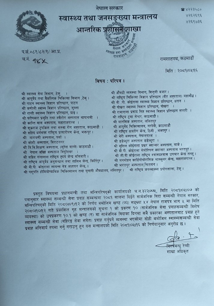 मन्त्रालयले स्वास्थ्य संस्थाहरुलाई पत्र पठाउँदै सार्वजनिक बिदाको दिनमा ओपीडी सेवासहित सबै प्रकारका सेवा प्रवाह गर्न निर्देशन दिएको हो ।