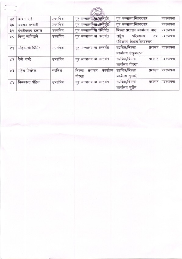 सोमबार प्रकाशित सरुवा सूची अनुसार सुर्खेत, पाल्पा, महोत्तरी, कालिकोट, डोटी, बर्दिया, दार्चुला, ओखलढुंगा, संखुवासभा, रोल्पा, हुम्ला र बझाङका प्रमुख जिल्ला अधिकारी फेरिएका छन् ।