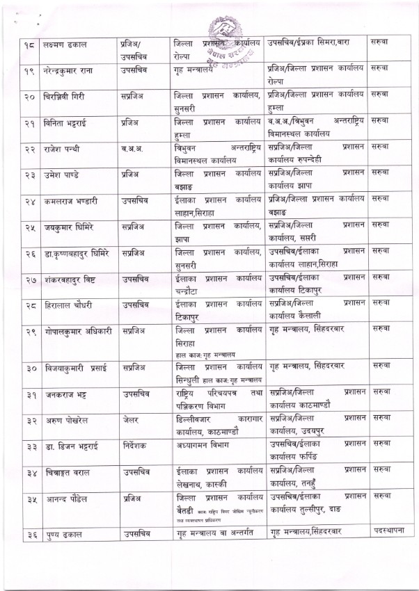 सोमबार प्रकाशित सरुवा सूची अनुसार सुर्खेत, पाल्पा, महोत्तरी, कालिकोट, डोटी, बर्दिया, दार्चुला, ओखलढुंगा, संखुवासभा, रोल्पा, हुम्ला र बझाङका प्रमुख जिल्ला अधिकारी फेरिएका छन् ।
