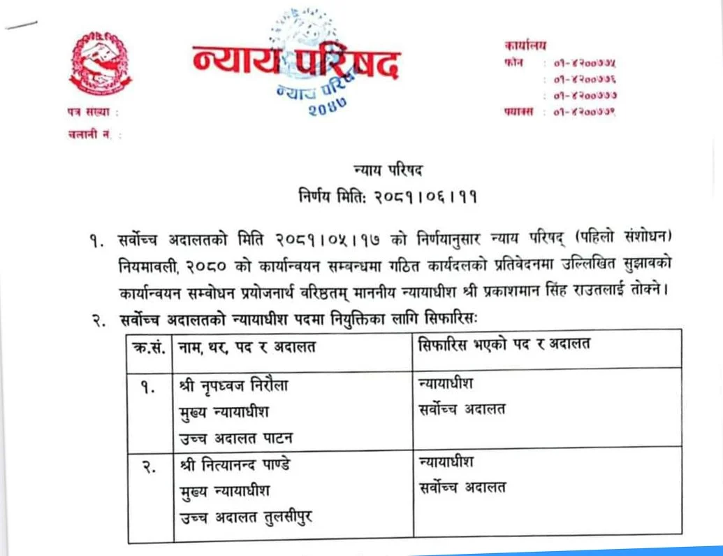 शुक्रबार बसेको परिषदको बैठकले उच्च अदालत पाटनका मुख्य न्यायाधीश नृपध्वज निरौला र उच्च अदालत तुलसीपुरका न्यायाधीश नित्यानन्द पाण्डेयलाई सर्वोच्च अदालतको न्यायाधीशका लागि सिफारिस गरेको हो ।