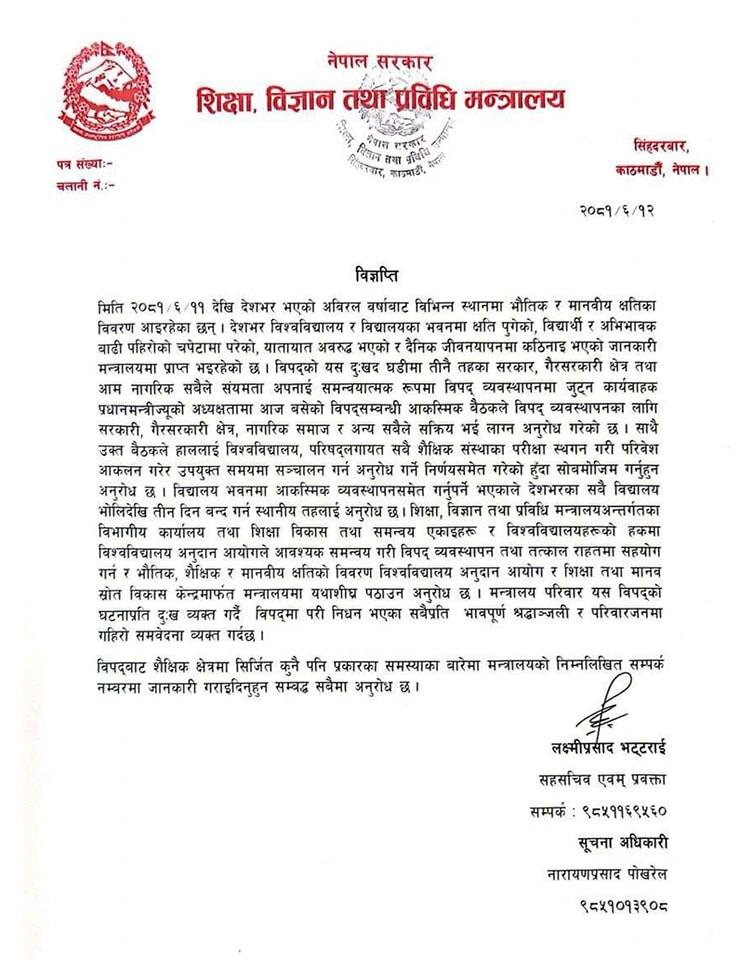 बाढी र पहिरोको असर सबै तिर परेको भन्दै ३ दिन विद्यालय बन्द गर्ने व्यवस्था मिलाउन शिक्षा, विज्ञान तथा प्रविधि मन्त्रालयले सबै स्थानीय तहलाई आग्रह गरेको हो ।