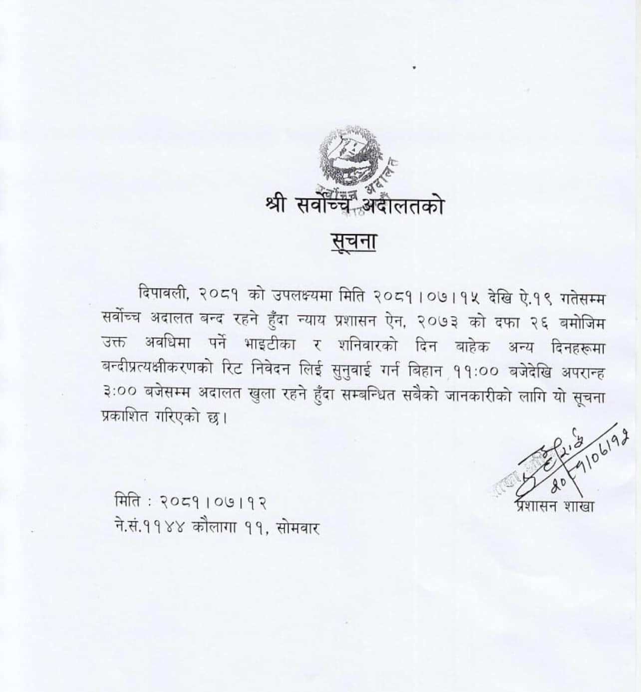 साथै, न्याय प्रशासन ऐन, २०७३ को दफा २६ बमोजिम उक्त अवधिमा पर्ने भाइटीका र शनिबारको दिन बाहेक अन्य दिनहरूमा बन्दीप्रत्यक्षीकरणको रिट निवेदन लिई सुनुवाइ गर्न बिहान ११ बजेदेखि अपरान्ह ३ बजेसम्म अदालत खुला रहने प्रकाशित सूचनामा उल्लेख छ।