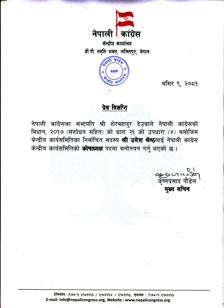 काठमाडौं । नेपाली कांग्रेसको केन्द्रीय कोषाध्यक्षमा उमेश श्रेष्ठ मनोनीत हुुनुभएको छ। सभापति शेरबहादुर देउवाले केन्द्रीय सदस्य श्रेष्ठलाई कोषाध्यक्षमा मनोनयन गरेको कांग्रेसले विज्ञप्तिमार्फत् जनाएको छ