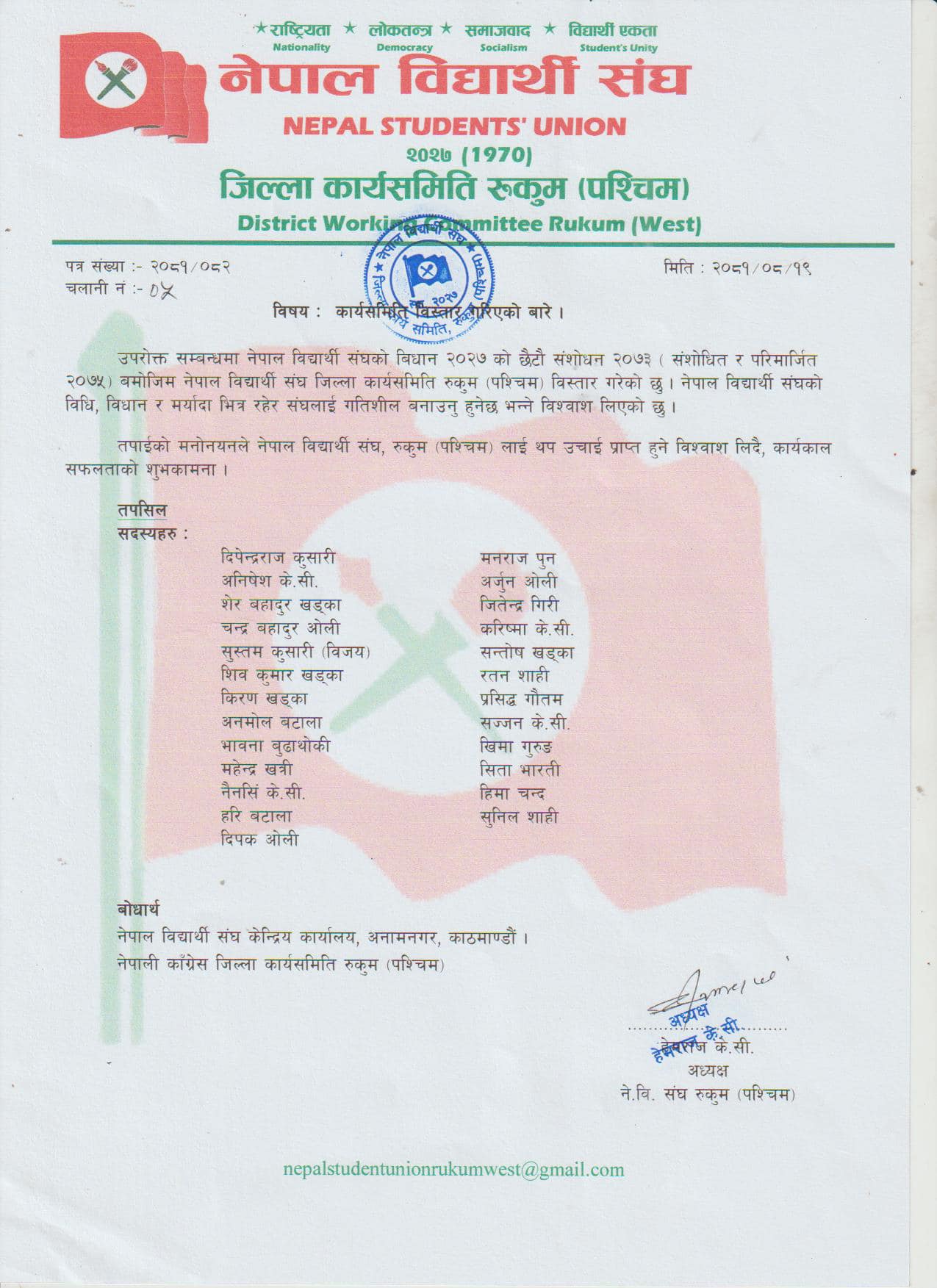 उहाँका अनुसार नेपाल विद्यार्थी संघको बिधान २०२७ को छैटौ संशोधन, २०७६ (संशोधित र परिमार्जित २०७५) बमोजिम जिल्ला कार्य समित बिस्तार गरिएको हो । उहाँले चार वटा विभागहरु समेत गठन गरिएको बताउनुभयो ।