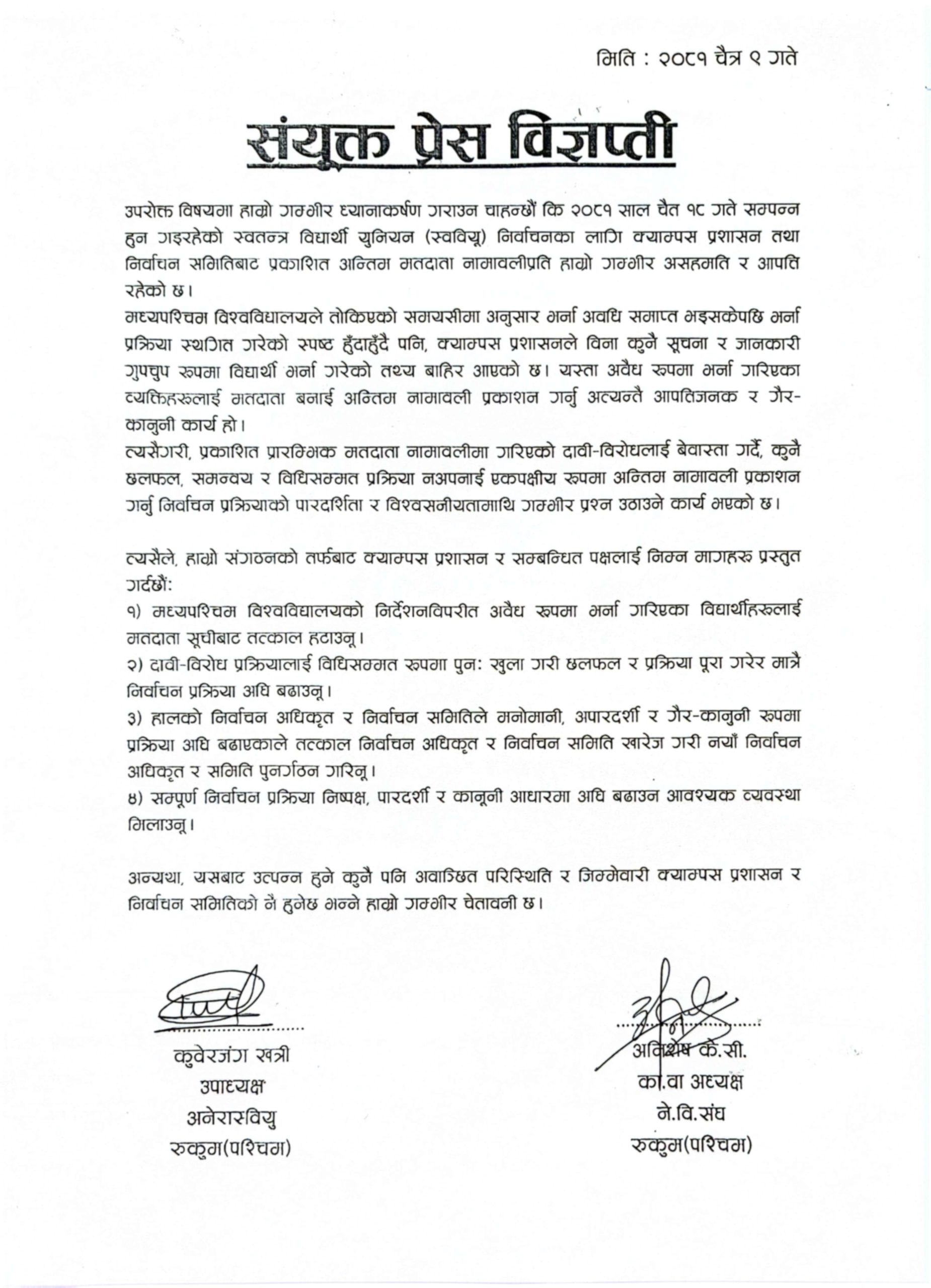 विज्ञप्तीमा मध्यपश्चिम विश्व विद्यालयको निर्देशन विपरित अवैध रुपमा भर्ना गरिएका विद्यार्थीहरुलाई मतदाता सूचिबाट तत्काल हटाउनुपर्ने, दाबी विरोध प्रक्रियालाई विधिसम्मत रुपमा पुनः खुला गरी छलफल प्रक्रियामार्फत मात्र निर्वाचन अगाडि बढाईनुपर्ने, हालको निर्वाचन अधिकृत र निर्वाचन समिति खारेज गरेर नयाँ निर्वाचन अधिकृत र निर्वाचन समिति गठन गरिनुपर्ने र निर्वाचन प्रक्रिया निश्पक्ष, पारदर्शी र कानूनी अधारमा अगाडि बढाईनुपर्ने माग राखिएको छ ।