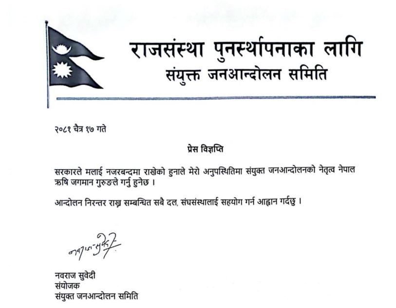 सरकारले आफूलाई नजरबन्दमा राखेको उल्लेख गर्दै सुवेदीले आइतबार प्रेस विज्ञप्ति जारी गर्दै भनेका छन्, ‘सरकारले मलाई नजरबन्दमा राखेको हुनाले मेरो अनुपस्थितिमा संयुक्त जनआन्दोलनको नेतृत्व नेपाल ऋषि जगमान गुरुङले गर्नु हुनेछ । आन्दोलन निरन्तर राख्न सम्बन्धित सबै दल, संघसंस्थालाई सहयोग गर्न आह्वान गर्दछु ।’