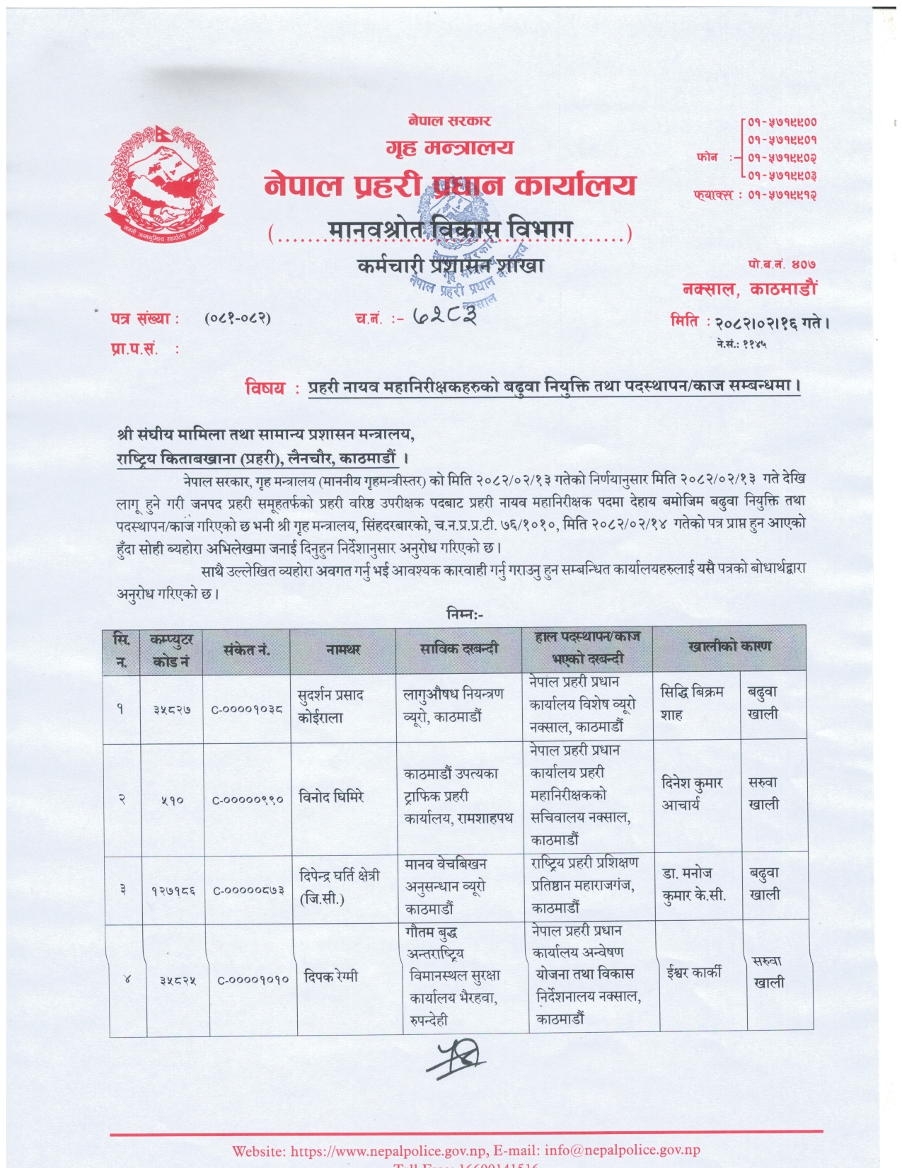 ओमबहादुर रानालाई अख्तियार दुरूपयोग अनुसन्धान आयोग, जयराज सापकोटाको कार्य विभाग कार्य निर्देशनालय, संजिब शर्मा दासको अपराध अनुसनधान विभाग अपराध अनुसन्धान निर्देशनालय र सुरेन्द्रबहादुर गुरूङको साइबर ब्युरोमा पदस्थापन भएको छ।