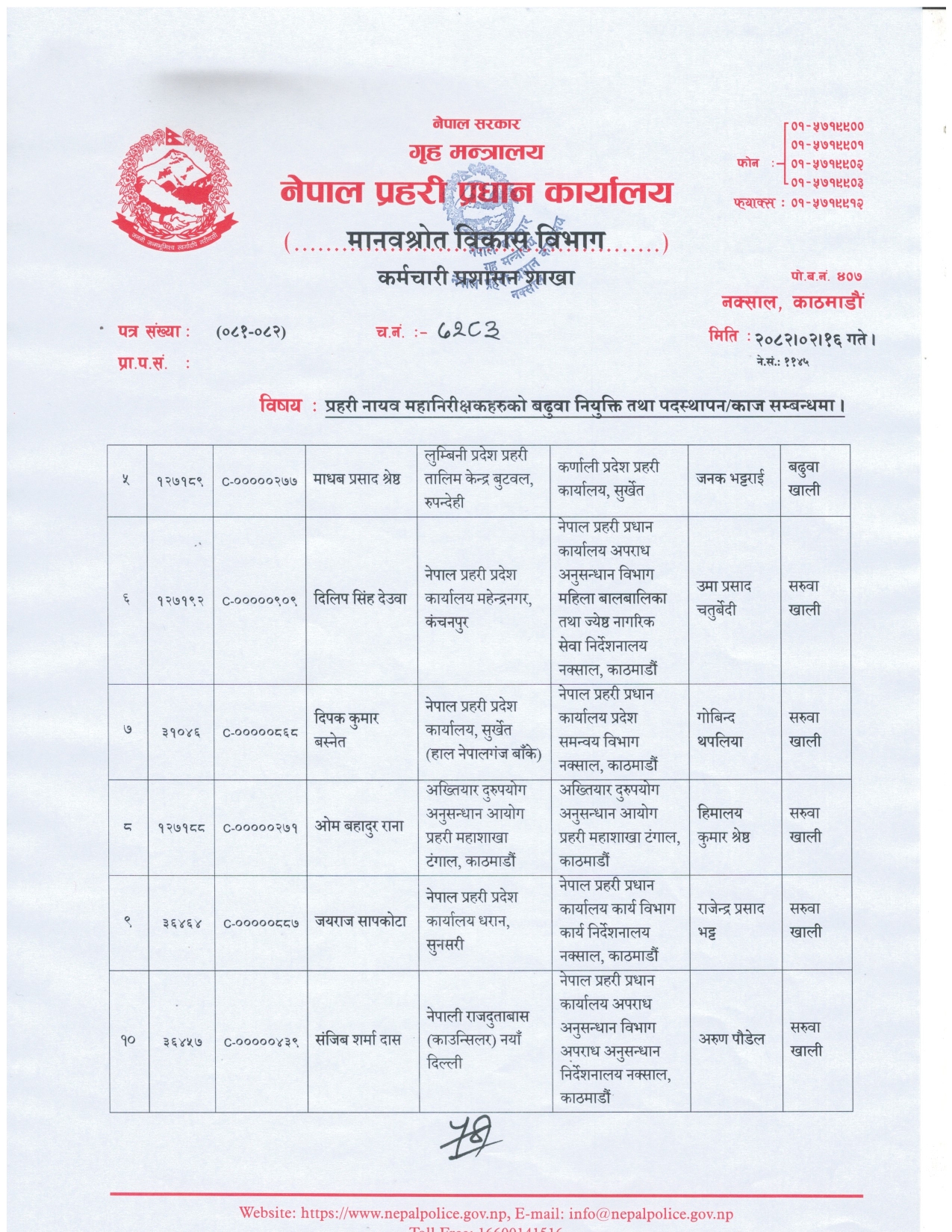 दीपक रेग्मीलाई अन्वेषण योजना तथा विकास निर्देशनालयमा, माधवप्रसाद श्रेष्ठलाई कर्णाली प्रदेश प्रहरी कार्यालय, दिलीप सिंह देउवालाई अपराध अनुसन्धान विभाग महिला बालबालिका तथा जेष्ठ नागरिक सेवा निर्देशनालय, दिपककुमार बस्नेत प्रदेश समन्वय विभागमा पदस्थापन भएको हो।