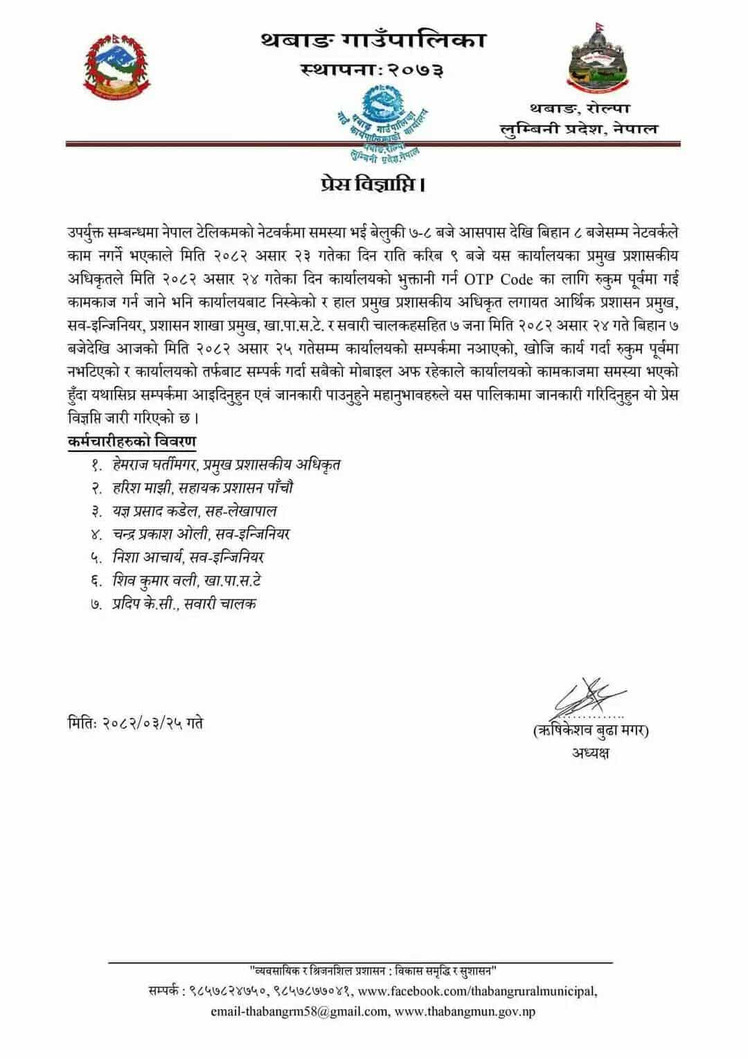थवाङ गाउँपालिकाका अध्यक्ष ऋषिकेशव बुढा मगरले असार २४ गतेदेखि आजसम्म कर्मचारीहरुसँग सम्पर्क हुन नसकेको भन्दै विज्ञप्ति जारी गरेका हुन् ।