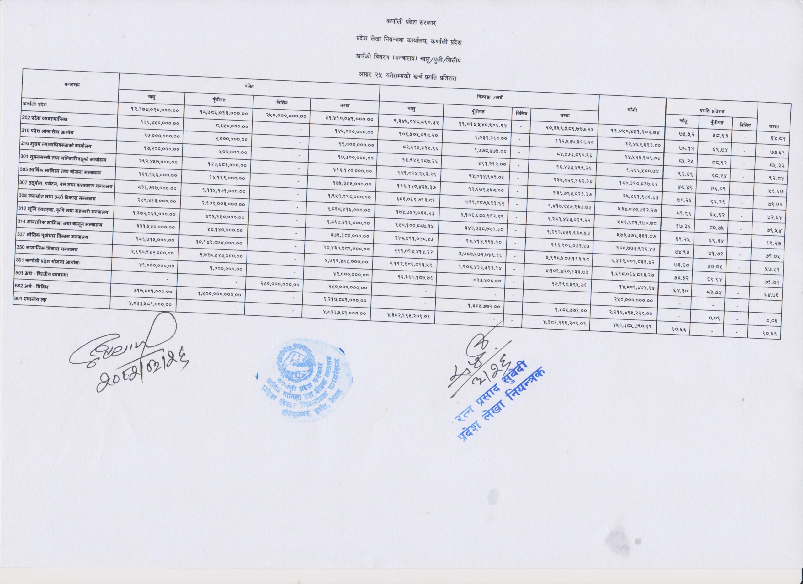 यस्तै चालु आर्थिक वर्षको अन्तिम भुक्तानी हुने दिन २५ असारसम्म कर्णाली प्रदेश सरकारले २० अर्ब ३० करोड ११ लाख ७१ हजार ७ सय ५७ रुपैयाँ खर्च गरेको छ ।