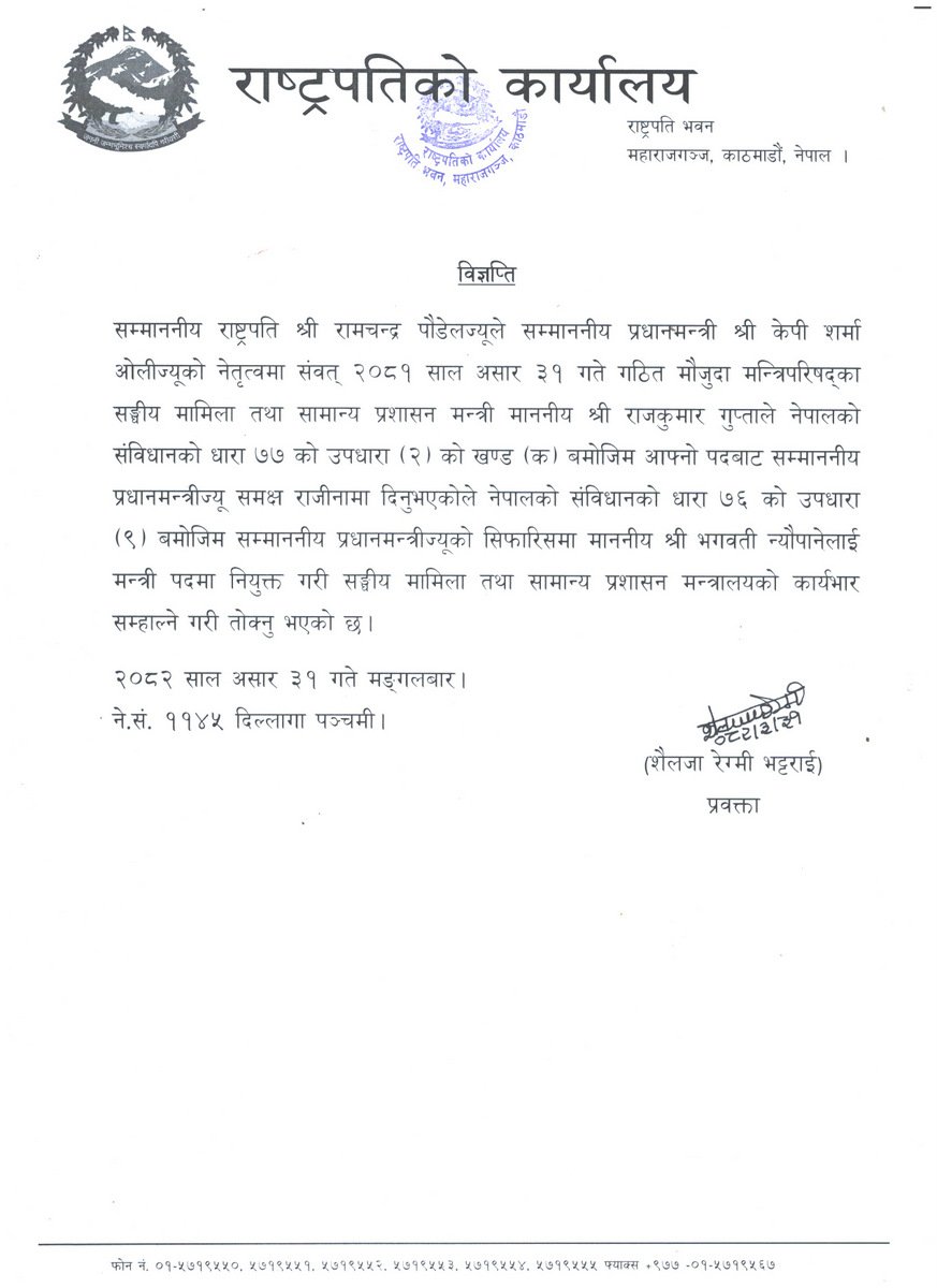 ‘नेपालको संविधानको धारा ७७ को उपधारा (२) को खण्ड (क) बमोजिम आफ्नो पदबाट सम्माननीय प्रधानमन्त्रीज्यू समक्ष राजीनामा दिनुभएकोले नेपालको संविधानको धारा ७६ को उपधारा (९) बमोजिम सम्माननीय प्रधानमन्त्रीज्यूको सिफारिसमा माननीय श्री भगवती न्यौपानेलाई मन्त्री पदमा नियुक्त गरी सङ्घीय मामिला तथा सामान्य प्रशासन मन्त्रालयको कार्यभार सम्हाल्ने गरी तोक्नु भएको छ,’राष्ट्रपति कार्यालयकी प्रवक्ता शैलजा रेग्मी भट्टराईद्वारा हस्ताक्षरित विज्ञप्तिमा भनिएको छ ।