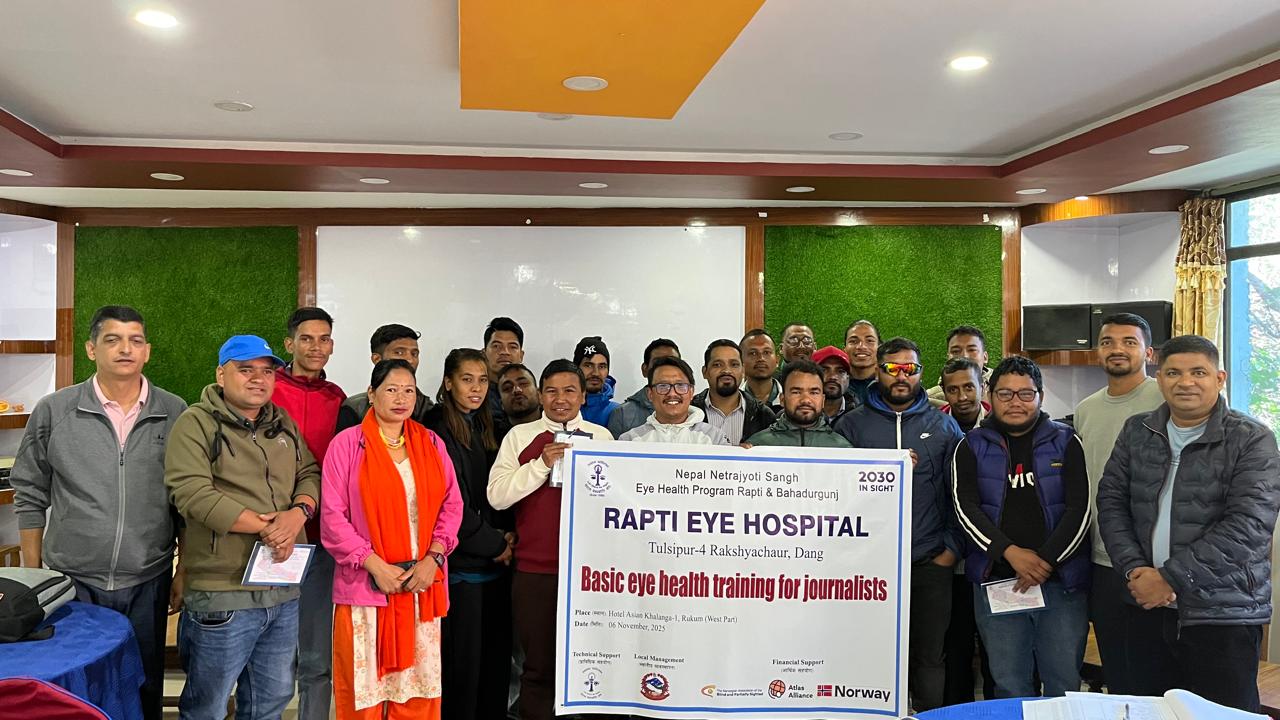 पत्रकारहरुलाई नेपाल नेत्रज्योति संघ, राप्ती आँखा अस्पतालको आयोजना एन.ए.वी.पी नर्वेको आर्थिक सहयोगमा पत्रकार महासघ रुकुम पश्चिमकाे समन्वयमा जिल्लामा  क्रियासील  पत्रकारहरुलाई आधारभुत आँखा स्वास्थ्य तालिम दिएको हो ।