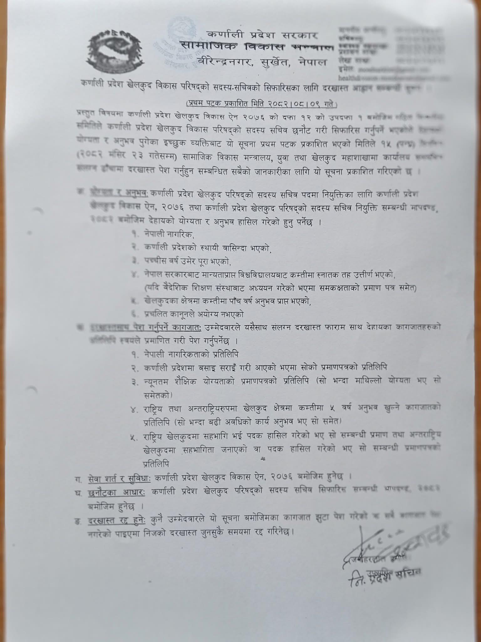 सुर्खेत । कर्णाली प्रदेश खेलकुद परिषद्को सदस्यसचिवका लागि दरखास्त आह्वान गरिएको छ । मंगलबार कर्णाली प्रदेश सामाजिक विकास मन्त्रालयले सूचना जारी गर्दै दरखास्त आह्वान गरेको हो ।