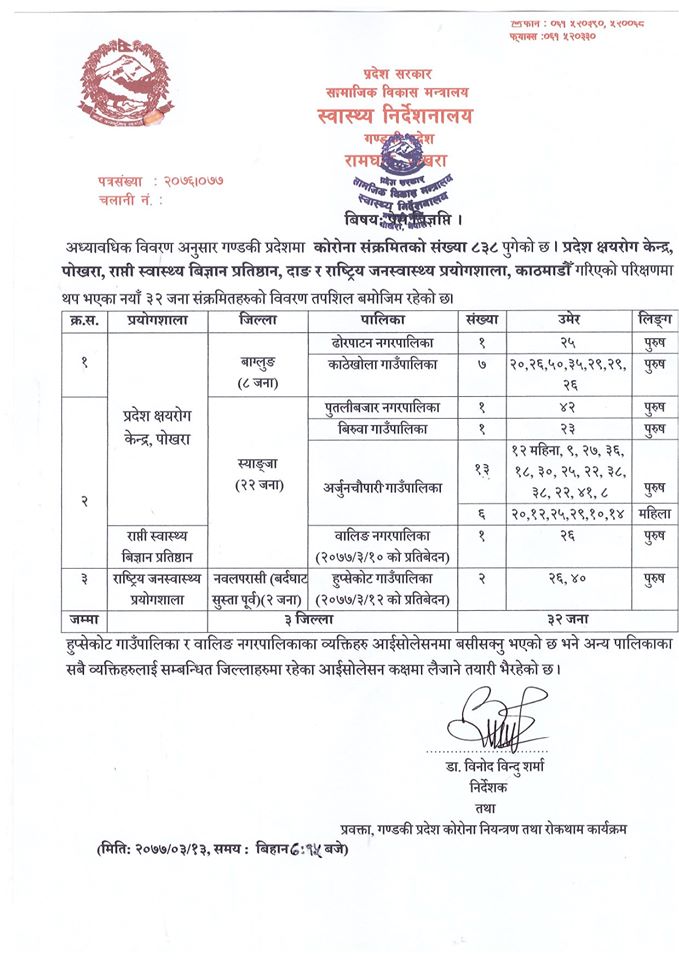 गण्डकी प्रदेश स्वास्थ्य निर्देशनालयका अनुसार बाग्लुङ, स्याङजा र नवलपरासी पूर्वमा थप ३२ जनामा कोरोना संक्रमण पुष्टि भएको हो।