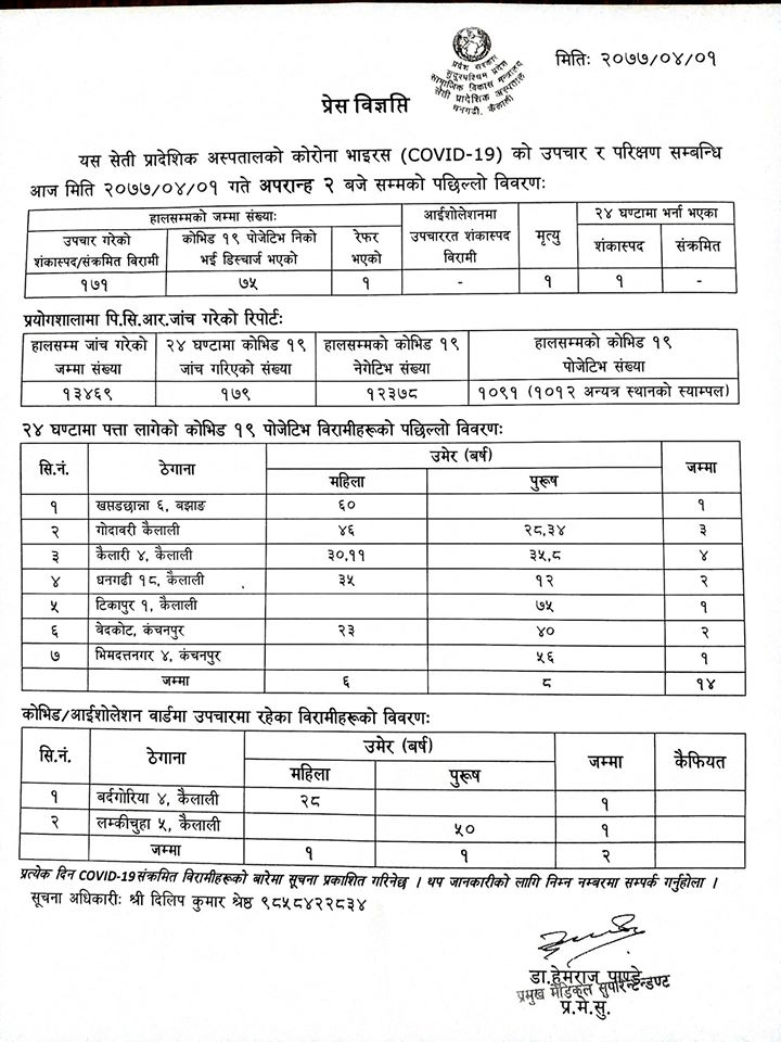 पछिल्लो २४ घण्टाको धनगढी प्रयोगशालामा गरिएको परीक्षणमा १४ जनामा सङ्क्रमण देखिएको सेती प्रादेशिक अस्पतालका सूचना अधिकारी दिलीप कुमार श्रेष्ठले बताए ।