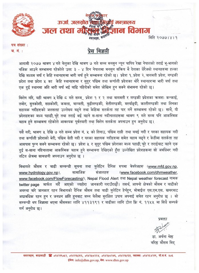 यी प्रदेशका मध्य पहाडी, चुरे तथा तराई भई बग्ने साना नदीमा साउन ९ गतेसम्म आकस्मिक बहाव हुने सम्भावना रहेकाले सतर्क रहन आग्रह गरिएको छ।