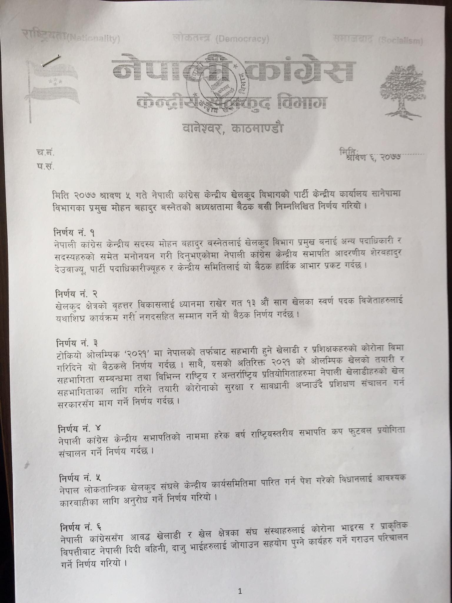 त्यस्तै, राष्ट्रिय खेलकुद परिषदमा कार्यरत कर्मचारीको १३ वर्षदेखि २४ वर्षसम्म सेवा अवधि पार गरेका कर्मचारीहरुको पदोन्नति नभएकोमा निजहरुको बढुवा प्रकृया अगाडि बढाउन माग गर्ने, नेपालको संविधानको भावना र मर्मविपरीत ओलम्पिक कमिटीले विदेशी निकायको सहायता लिँदा सरकारको स्वीकृति लिनु नपर्ने जुन ऐन ल्याएको छ, त्यसको खारेजीको माग गर्ने निर्णय गरेको छ ।