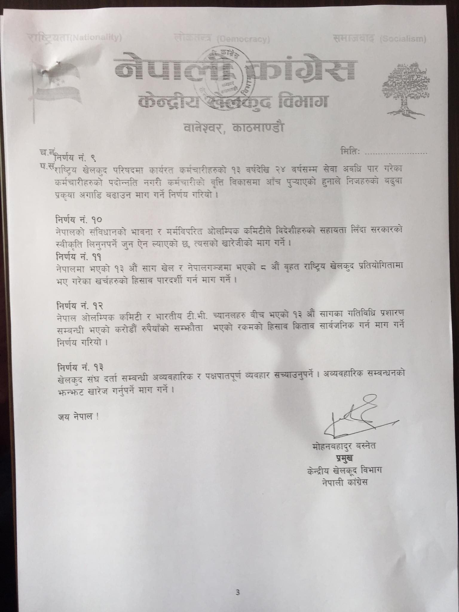 यसैगरी नेपालमा सम्पन्न १३ औँ साग खेल र नेपालगञ्जमा सम्पन्न ८ औँ राष्ट्रिय खेलकुद प्रतियोगितामा भए गरेका खर्चहरुको हिसाव पारदर्शी गर्न माग गर्ने, नेपाल ओलम्पिक कमिटी र भारतीय टिभी च्यानलहरु बीच भएको १३ औँ सागका गतिविधि प्रशारणसम्बन्धी भएको करोडौं रुपैयाँको सम्झौता भएको रकमको हिसाव किताव सार्वजनिक गर्न माग गर्ने तथा खेलकुद संघ दर्तासम्बन्धी अव्यवहारिक र पक्षपातपूर्ण व्यवहार सच्याउनु पर्ने मागसहित निर्णय गरेको छ ।