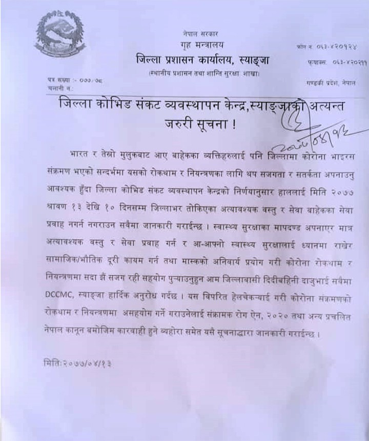 काठमाडौँ । कोरोना संक्रमण बढेपछि स्याङ्जामा मंगलबारदेखि १० दिनसम्मका लागि अत्यावश्यकबाहेकका सेवा बन्द गर्न जिल्ला प्रशासन कार्यालयले अनुरोध गरेको छ । जिल्ला प्रहरी कार्यालय स्याङ्जामा कार्यरत एसपी सहित १८ जना प्रहरी कर्मचारीलाई एकैपटक कोरोना पुष्टि भएपछि जिल्ला प्रशासन कार्यालयले मंगलबार देखि १० दिनसम्म अत्यावश्यकबाहेक सबै सेवा बन्द गरेको हो ।