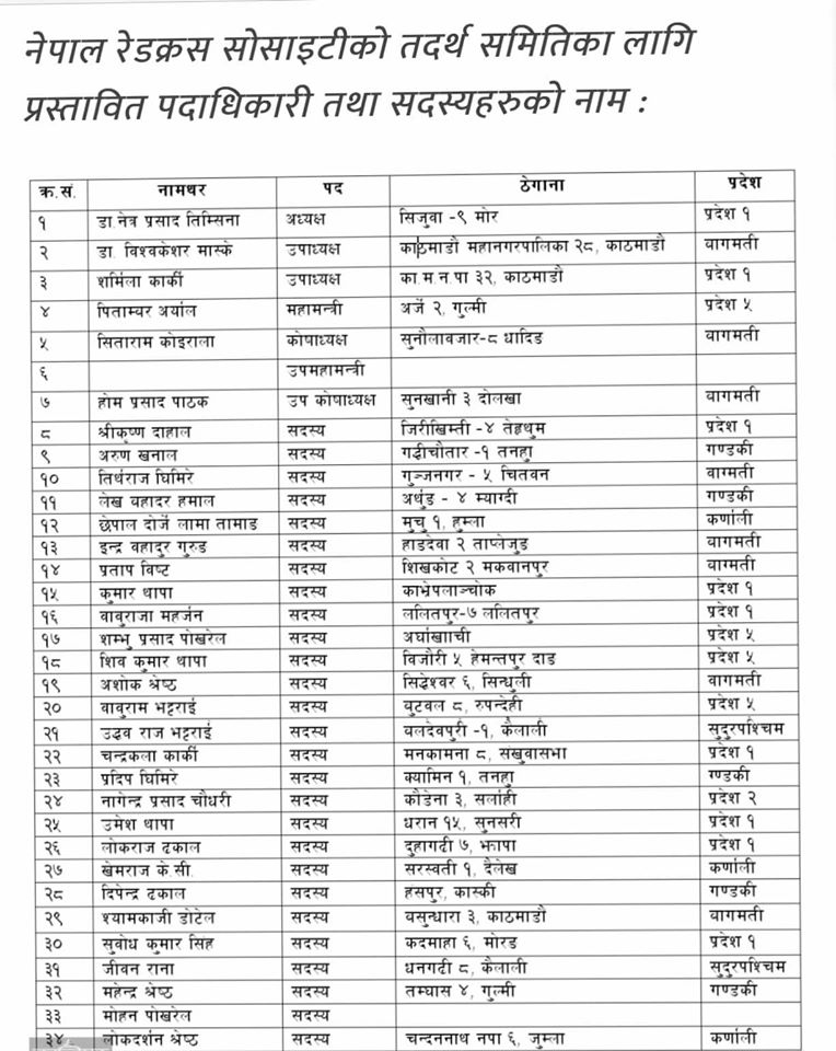 उपाध्यक्षमा काठमाडौँका डा.विश्वकेशर मास्के र अर्का उपाध्यक्षमा काठमाडौँका शर्मिला कार्की रहेका छन । यस्तै महामन्त्रीमा मुल्मीका पिताम्बर अर्याल छन भने कोषाध्यक्षमा धादिङका सिताराम कोइराला रहेका छन । सरकारले अध्यक्ष सहित ३४ जनाको तदर्थ समिति गठन गरेको हो ।