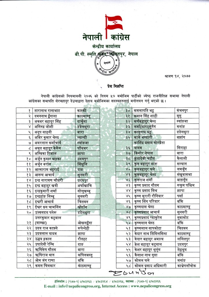 ज्येष्ठ राजनीतिज्ञ सभामा सभापति देउवाले नेपाली कांग्रेसको नियमावली २०७६ को नियम ५० बमोजिम सदस्य मनोनित गरेको केन्द्रीय कार्यालयका सचिवले जारी गरेको प्रेस विज्ञप्तिमा जनाइएको छ ।
