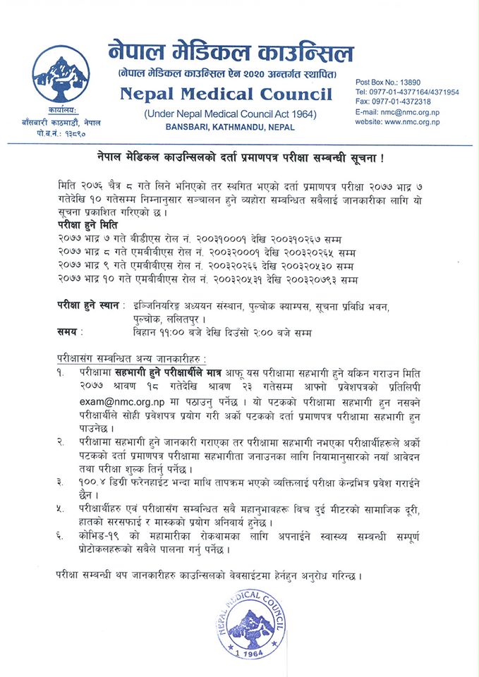भदौ ७ गते बिडिएस र भदौ ८ ९ र १० गते एमबिबिएसको परीक्षा हुने तालिका सार्वजनिक भएको छ।