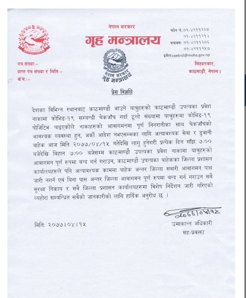 गृह मन्त्रालयका सहप्रवक्ता उमकान्त अधिकारीले जारी गरेको विज्ञप्तिमा अत्यावश्यक सेवा र दुवानीबाहेक आजबाट लागू हुने गरी प्रत्येक दिन साँझ ७ बजेबाट बिहान ७ बजेसम्म काठमाडौं उपत्यका प्रवेश नाकामा यात्रुहरूको आवागमन पूर्णरूपमा बन्न गुराउननेु भनिएको छ ।