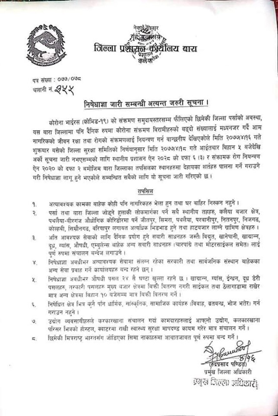 बारामा दैनिक संक्रमितको संख्या बढ्दै गएकोले स्थान निर्धारण गरेर आइतबार बिहान ५ बजेदेखि अर्को सूचना जारी नभएसम्मका लागि निषेधाज्ञा जारी गरिएको बाराका प्रमुख जिल्ला अधिकारी रुद्रप्रसाद पण्डितले बताए ।