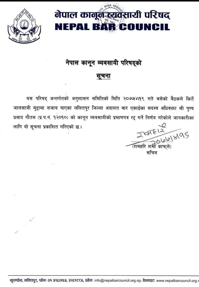 काठमाडौं । ललितपुर जिल्ला अदालत बार एकाइका सदस्य अधिवक्ता पुण्य प्रसाद गौतम (प्र.प.न. १२०१०) काे कानुन व्यवसायीको प्रमाण-पत्र रद्द भएको छ । नेपाल कानुन व्यवसायी परिषद्को अनुशसन समितिले सोमबार मिलापत्रमा किर्ते गरेको पाइएपछि गौतमको लाइसेन्स खारेज गर्ने निर्णय गरेको हो। गौतम सर्वोच्च अदालतबाटै किर्तेमा दोषी ठहर भएका थिए।