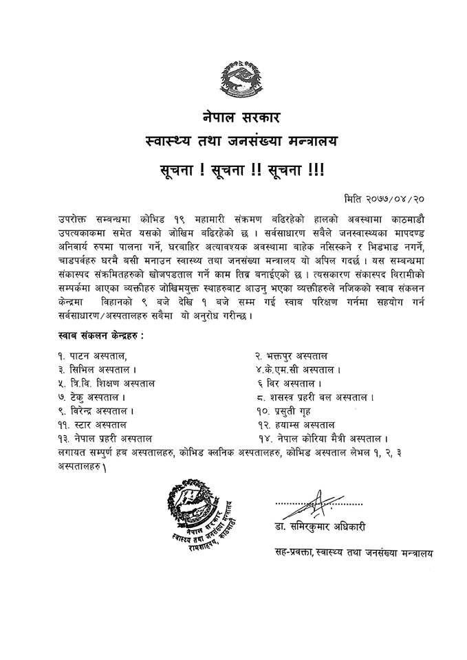 शंकास्पद बिरामीको सम्पर्कमा आएका व्यक्तिहरु, जोखिमयुक्त ठाउँबाट आएकाहरुले यी अस्पतालमा स्वाब परीक्षण गराउन सक्ने मन्त्रालयले जनाएकाे छ ।