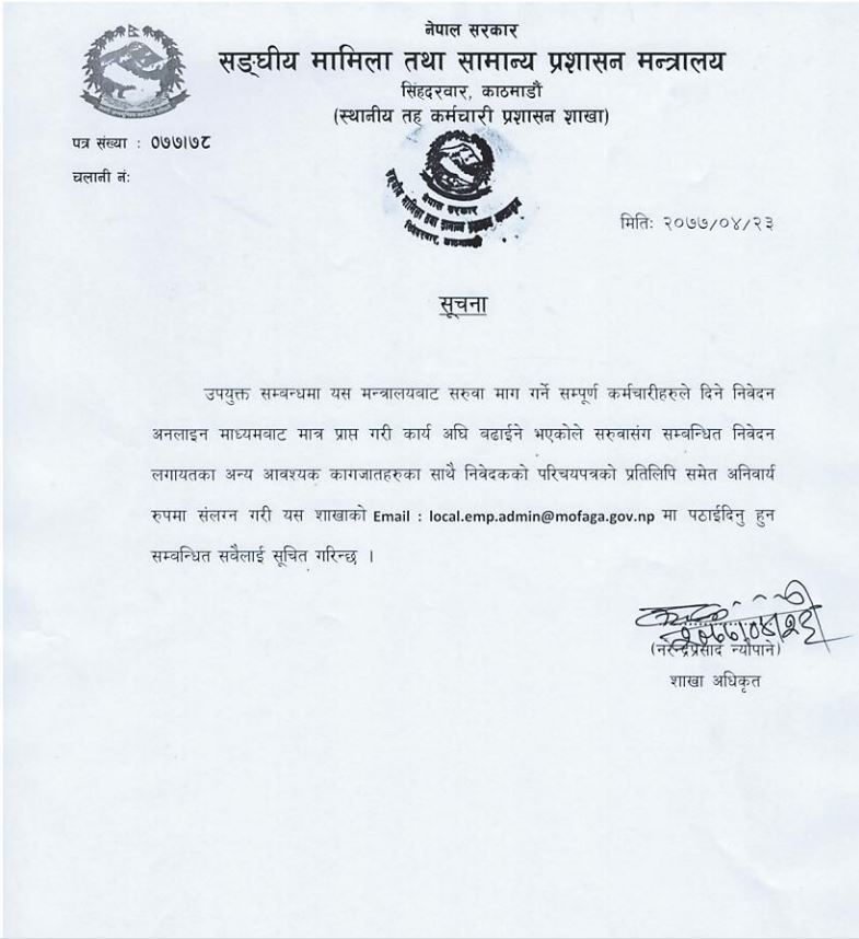 मन्त्रालयबाट सरुवा माग गर्ने कर्मचारीहरूले अनलाइन निवेदनको साथमा आवश्यक कागजात र परिचयपत्रको प्रतिलिपिसमेत अनिवार्य पठाउनु पर्ने मन्त्रालयकाे स्थानीय तह कर्मचारी प्रशासन शाखाका शाखा अधिकृत नेरेन्द्र प्रसाद न्यौपानेले जानकारी दिएका छन । हेर्नुहोस् सूचना