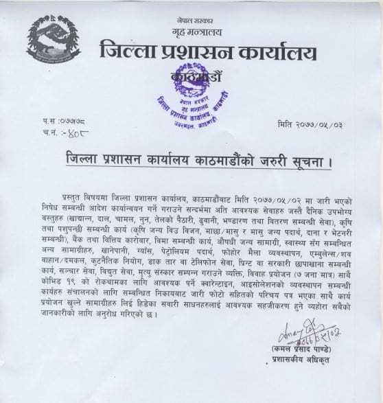 यो अवधिमा अत्याआवश्यक बाहेकका अरु कुनै पनि काम नगर्न नगराउन जिल्ला प्रशासन कार्यालयले सूचना जारी गरेका छन्। त्यसै क्रममा काठमाडौँ जिल्ला प्रशासन कार्यालयले विवाहलाई अत्याआवश्यकीय कार्यको सूचीमा राखेर त्यसका लागि सातजना भन्दा बढीलाई सडकमा हिड्न, भेला हुन अनुमति नदिने निर्णय गरेको प्रशासकीय अधिकृत कमलप्रसाद पाण्डेले जानकारी दिए।