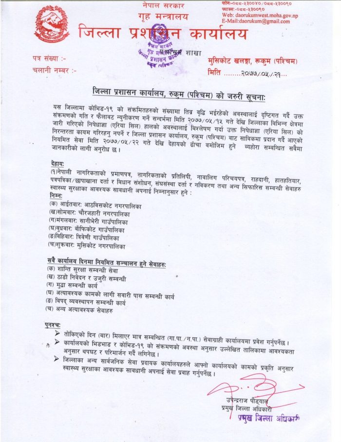 सदरमुकाम मुसिकोट खलंगा सहित आसपासका बजारहरु पुर्णरुपमा बन्द रहेका थिए भने आवतजावतमा पनि कडाई गरिएको थियो । त्यस्तै प्रशासनबाट प्रदान हुने सेवाहरुको स्थानीय तह अनुसारको समय निर्धारण गरिएको छ ।