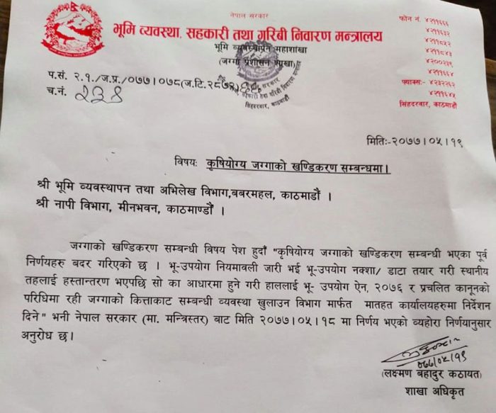 दहितले बन्द गराएको कित्ताकाट अर्यालले फुकुवा गरेकी हुन । भू–उपयोग ऐन र प्रचलित कानूनको परिधिमा रही जग्गाको कित्ताकाट खुलाउन मन्त्रालयले मातहतका कार्यालयलाई परिपत्र गरेको हो। भू–उपयोग नियमावली जारी भई भू–उपयोग नक्शा र डाटा तयार गरी स्थानीय तहलाई हस्तान्तरण नहुन्जेलसम्मका लागि कृषियोग्य जग्गामा कित्ताकाट गर्न सकिने मन्त्रालयले जनाएको छ।