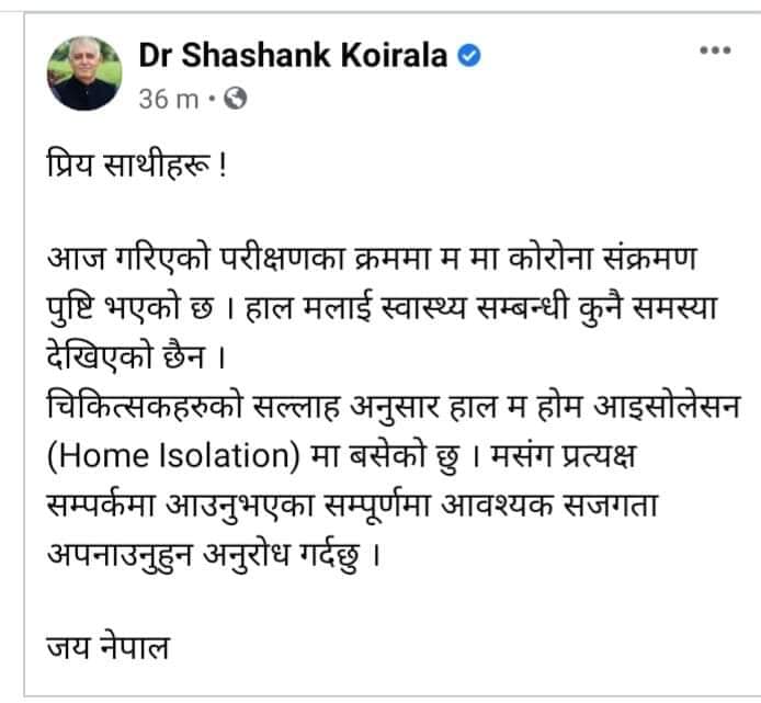 कोइराला चिकित्सकहरुको सल्लाहअनुसार होम आइसोलेसनमा बसेका छन् । उनले आफूसँग प्रत्यक्ष सम्पर्कमा आएका सबैलाई आवश्यक सजगता अपनाउन अनुरोधसमेत गरेका छन् ।