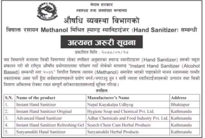 भक्तपुरस्थित नेपाल कायाकल्प उद्योगको इन्सटेन्ट ह्यान्ड सेनिटाइटर, काठमाडौंस्थित हाइजिन सोप एन्ड केमिकल प्रालिको इन्सटेन्ट ह्यान्ड स्यानिटाइजर ओरिजनल, आधार केमिकल्स एन्ड फुड इन्डस्ट्रीको एडभान्स ह्यान्ड स्यानिटाइजर, सर्च केम कम हर्बल प्रडक्टको इन्सटेन्ट ह्यान्ड स्यानिटाइजर रिफ्रेसिङ जेल र सूर्यमुखी हर्बल प्रडक्टको सूर्यमुखी ह्यान्ड स्यानिटाइजरमा मेथानोल भेटिएको औषधि व्यवस्था विभागले जनाएको छ ।