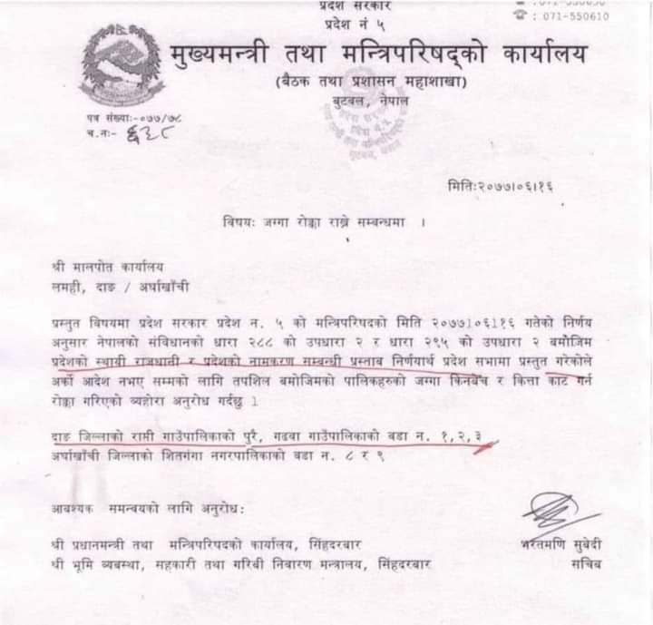दाङको राप्ती गाउँपालिकाका पूरै भाग, गढवा गाउँपालिकाका वडा नम्बर १,२ र ३ का साथै अर्घाखाँचीको शितगंगा नगरपालिकाका वडा नम्बर ८ र ९ मा जग्गाको कित्ताकाट र किनबेचमा रोक लगाइएको मुख्यमन्त्री तथा मन्त्रिपरिषद् कार्यालयको प्रशासन महाशाखाका सचिव भरतमणी सुवेदीले जानकारी दिए।