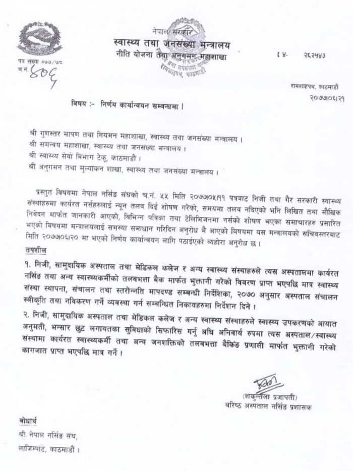 मन्त्रालयले निजी, सामुदायीक अस्पताल तथा मेडिकल कलेज र अन्य स्वास्थ्य सस्थाहरुले स्वास्थ्य उपकरणको आयात अनुमती, भन्सार छुट लगायतका सिफारिस गर्नुअघि अनिवार्य रुपमा त्यस संस्थामा कार्यरत स्वास्थ्यकर्मी तथा जनशक्तिको तलबभत्ता बैंकिङ प्रणाली मार्फत भुक्तानी गरेको कागजपत्र बुझाएपछि मात्र पाउने भएका छन्।