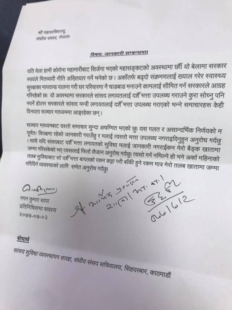 दसैँ भत्ता बापत सांसदहरूको खातामा एक महिनाको तलब बराबरको रकम सांसदहरूका खातामा पठाइएको थियो। महामारीका बेला पनि भत्ता लिएको भन्दै आलोचना भएपछि सांसदहरू फिर्ता गरेको घोषणा गर्न थालेका हुन्।