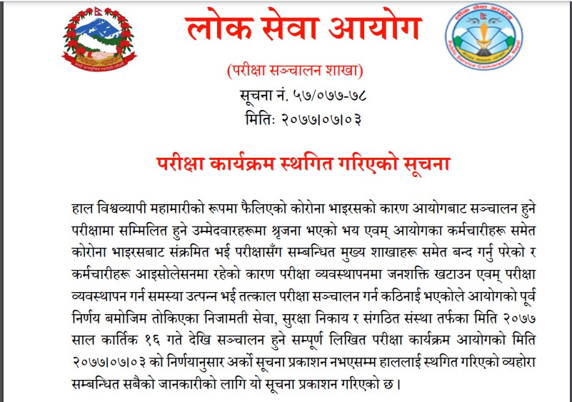 कोरोनाभाइरसका कारण परीक्षार्थीमा देखिएको भय र आयोगका कर्मचारी नै कोरोना संक्रमित भएर आइसोलेसनमा बसेकाले परीक्षा स्थगित गरेको आयोगले जनाएको छ। गत चैतमा हुनु पर्ने राजपत्रांकित तृतीय श्रेणीको लगायत लिखित परीक्षा हुन बाँकी छ।