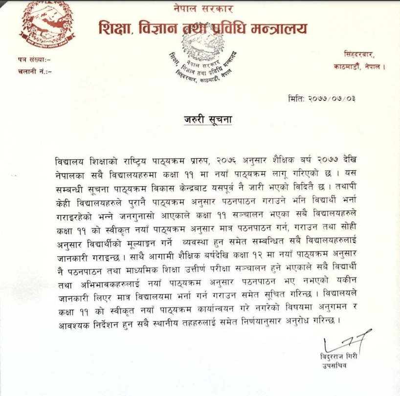 कक्षा ११ मा नयाँ पाठ्यक्रम अनुसार कक्षा संचालन भएको यकिन गरेर मात्र विद्यार्थी भर्ना गर्न समेत मन्त्रालयले सबै अभिभावहरूलाई आग्रह समेत गरेको छ।