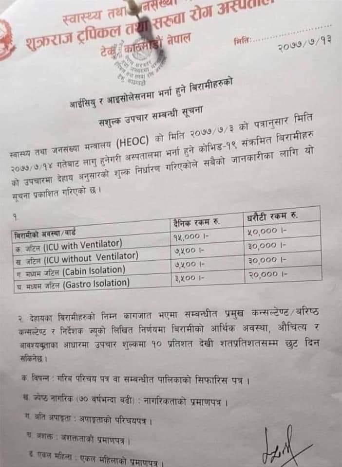 अस्पतालमा निशुल्क उपचार पाउने सबै बिरामीको विवरण सार्वजनिक गर्ने उनले बताए। अस्पतालले सार्वजनिक गरेको उपचार शुल्क विवरण अनुसार भेन्टिलेटरसहितको आईसीयूमा उपचार गर्नुपर्ने कोभिड बिरामीले दैनिक १५ हजार रकम तिर्नुपर्नेछ। ५० हजार धरौटी रकम तोकिएको छ।