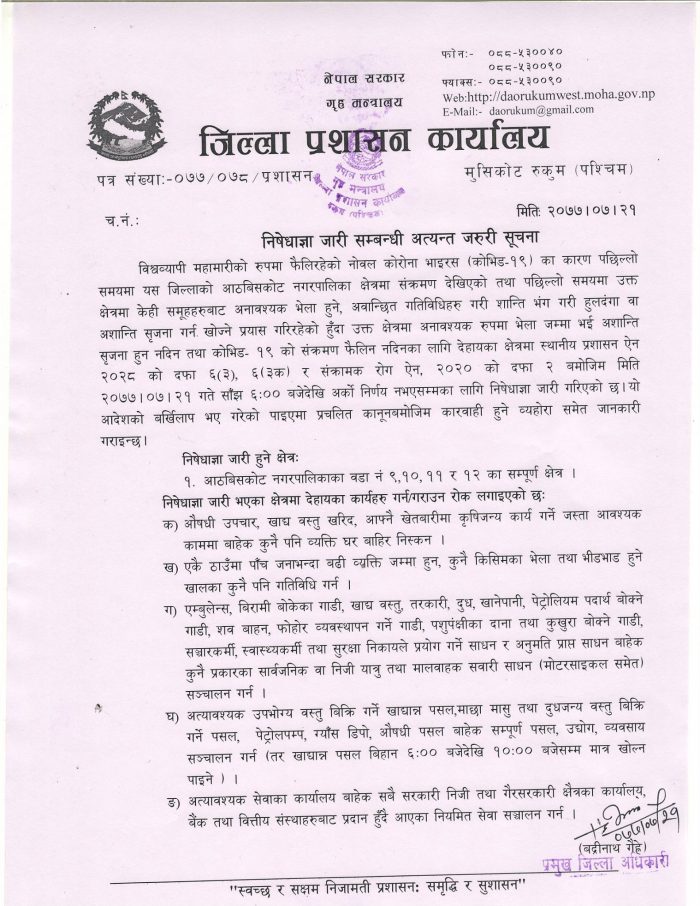 जिल्ला प्रशासन कार्यालयले शुक्रबार बेलुका ६ बजेदेखि अर्को सूचना नआउञ्जेलसम्मका लागि निषेधाज्ञा लगाएको जनाएको छ । शुक्रबार प्रशासन ले एक सूचना जारी गरेर आठबीसकोट नगरपालिकाका ९, १०, ११ र १२ नम्बर वडाको सम्पूर्ण क्षेत्र निषेधाज्ञा गरिएको जनाएको छ ।